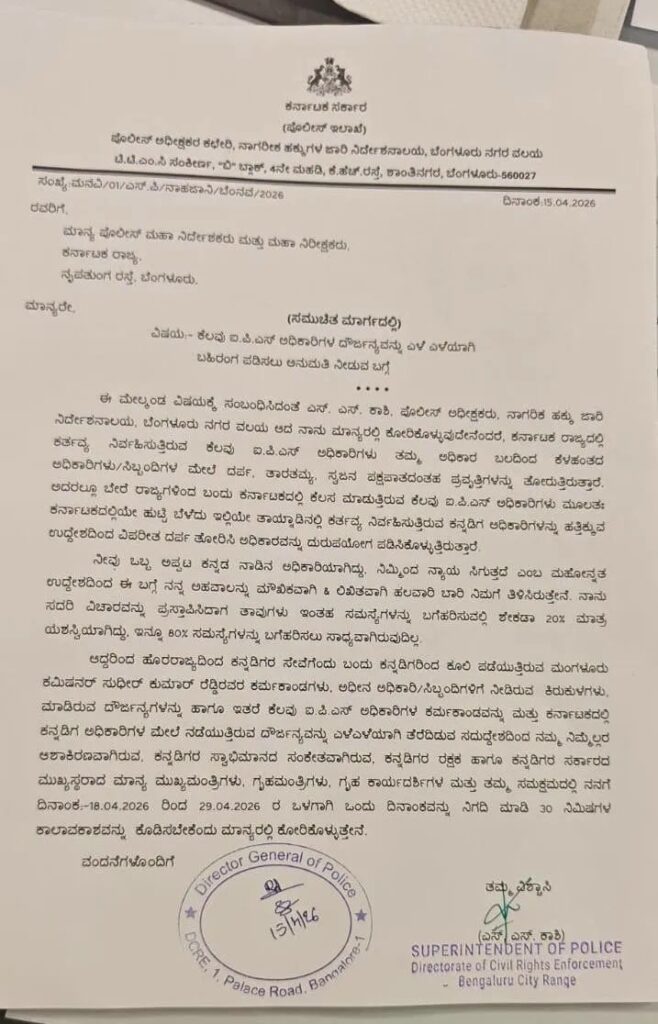 ಅನವಶ್ಯಕವಾಗಿ ಕಮಿಷನರ್ ರವರು ಹಿಂಸೆಗೀಡು ಮಾಡುತ್ತಿದ್ದಾರೆ, ಅವರಿಗೆ ಕರ್ನಾಟಕದ ಅಧಿಕಾರಿಗಳ ಮೇಲೆ ಪ್ರೀತಿ ಇದ್ದಂತೆ ಕಾಣುತ್ತಿಲ್ಲ. ಟಾರ್ಗೆಟ್ ಮಾಡಿ ನಡೆದುಕೊಳ್ಳುತ್ತಾರೆ ಎಂಬ ಅರ್ಥದಲ್ಲಿ ಪತ್ರ ಬರೆದಿರುವ ಕಾಶೀನಾಥ್ ನನಗೆ ಭೇಟಿಗೆ ಅವಕಾಶ ಕೊಡಬೇಕು ಎಂದು ತಾಕೀತು ಮಾಡಿ, ಸಂದರ್ಭದಲ್ಲಿ ಕಮಿಷನರ್ ರವರ ಎಲ್ಲಾ ವಿವರವನ್ನು ಬಿಚ್ಚಿಡುತ್ತೇನೆ ಅಂತ ಕಠಿಣವಾಗಿ ಪತ್ರ ಬರೆದಿದ್ದಾರೆ ಎನ್ನಲಾಗಿದೆ. ಅಷ್ಟಕ್ಕೂ ಪತ್ರ ಬರೆದ ಕಾಶೀನಾಥ್ ರವರ ಹಿನ್ನೆಲೆ ಹಾಗೂ ಅವರ ಇಲಿಯವರೆಗಿನ ಕಾರ್ಯವೈಖರಿಯನ್ನ ಗಮನಿಸಬೇಕು ಹಾಗೂ ತನಿಖೆಗಳ ಪಡಿಸಬೇಕು ಎಂಬ ವಾದವು ಪೊಲೀಸ್ ಇಲಾಖೆಯ ಒಳಗಿನಿಂದ ಕೇಳಿ ಬರುತ್ತಿದೆ.