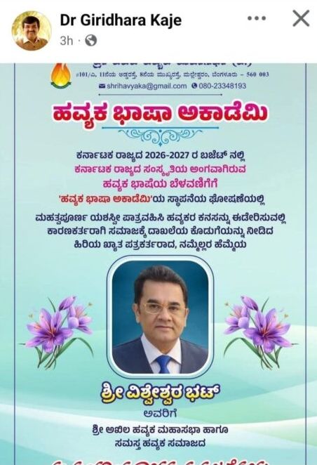 2026– 27ರ ಬಜೆಟ್ಟಿನಲ್ಲಿ ಹವ್ಯಕ ಭಾಷಾ ಅಕಾಡೆಮಿಯನ್ನು ಸ್ಥಾಪಿಸಲು ನಿರ್ಣಯ ತೆಗೆದುಕೊಳ್ಳಲಾಗಿದೆ ಎನ್ನುವುದನ್ನು ಹಣಕಾಸು ಸಚಿವರು ಆದ ಮುಖ್ಯಮಂತ್ರಿ ಸಿದ್ದರಾಮಯ್ಯನವರು ಘೋಷಿಸಿದ್ದಾರೆ. ಯಾವಾಗ ಇಂತಹದೊಂದು ಘೋಷಣೆ ಹೊರಬರುತ್ತದೆ ತಕ್ಷಣವೇ ಈ ಒಂದು ಅಕಾಡೆಮಿ ಸ್ಥಾಪನೆಯ ಕ್ರೆಡಿಟ್ ಅನ್ನು ಪಡೆದುಕೊಳ್ಳಲು ಹಾಗೂ ಆ ಅಕಾಡೆಮಿಯ ಮೊದಲ ಅಧ್ಯಕ್ಷ ಸ್ಥಾನಕ್ಕೆ ಇರಲು ಪೈಪೋಟಿ ಶುರುವಾಗಿದೆ.