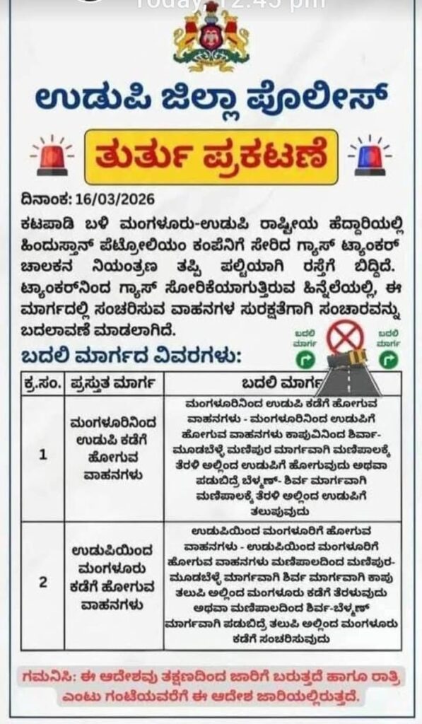 • 🚫 ಸಂಚಾರ ನಿರ್ಬಂಧ: ಮಂಗಳೂರು–ಉಡುಪಿ ಹೆದ್ದಾರಿಯಲ್ಲಿ ತಾತ್ಕಾಲಿಕವಾಗಿ ವಾಹನ ಸಂಚಾರವನ್ನು ತಿರುಗಿಸಲಾಗಿದೆ.
